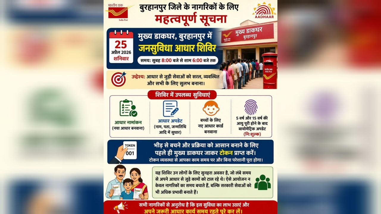 aadharcardmegacampबुरहानपुर जिले के नागरिकों के लिए एक महत्वपूर्ण सूचना सामने आई है। 25 अप्रैल 2026, शनिवार को मुख्य डाकघर बुरहानपुर में एक विशेष जनसुविधा आधार शिविर का आयोजन किया जा रहा है। यह शिविर सुबह 8 बजे से शाम 6 बजे तक संचालित होगा, ताकि अधिक से अधिक लोग इसका लाभ उठा सकें। इस पहल का उद्देश्य आधार से जुड़ी सेवाओं को सरल, व्यवस्थित और सभी के लिए सुलभ बनाना है।