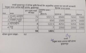 Burhanpur Mandi Today’s Rates बुरहानपुर कृषि उपज मंडी में 21 जनवरी गुरूवार को सोयाबीन अरहर गेंहुं मक्का कुल 4 फसलो की कुल आवक 1801 क्विंटल रही सोयाबीन की आज कुल आवक 122 क्विंटल रही और न्यूनमत भाव 4251 अधितम 5253 और प्रचलित भाव 5200 रहे इसी तरह तुअर अरहर की कुल आवक 1021 क्विंटल रही न्यूनतम भाव 6500 अधिकतम 7650 और प्रचलित भाव 7000 रूपए प्रति क्विंटल रहे आज मंडी में गेंहुं की आवक कोई खास नहीं रही केवल साढे 7 क्विंटल गेंहु की आवक रही जिसकेे न्यनतम भाव 2350 अधिकतम भाव 2350 और प्रचलित भाव 2350 रहे